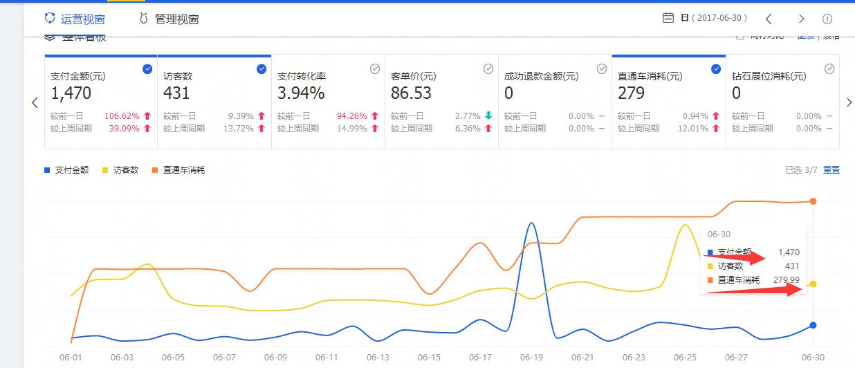 经过一个月的努力后,6月份店铺访客与成交金额都有明显的增长趋势,同时直通车的花费也相比之前多了一倍的支出,有此情况下,证明我们的选款是对的,直通车的推广对整店的成长也是起到了重大的推动作用,同时店铺的开店时长还未到3个月的时间,任何的活动也基本是无缘参与的,为了不错过行业的黄金时间,大家商议后一致决定加大直通车推广,让产品成长的更快,迅速抢占市场.