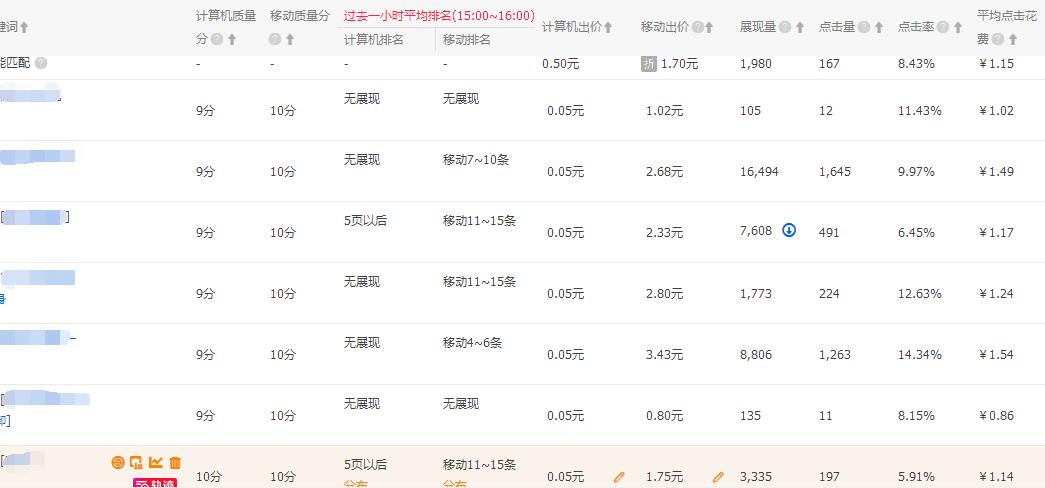 现在可以看到这个单品现在推广的所有关键词无线端的质量分都是10分的样子,这还是得益于不断优化的一个结果. 推广的关键词从最初的5个,10个 慢慢的增加到现在的22个.推广直通车大家最难搞定的也是最希望去学习到的就是如何提升关键词质量得分,不同的产品有不同的操作方法,而我选择的是保守型的操作手法, 通过精准推广适合词,这里所讲的适合词既不是类目的大词与热词,也不是流量少得可怜的长尾词,而是具有一定的市场搜索容量,即使添加到直通车中质量得分并不高,但是可以通过优化提升的词,提升质量分我一般是通过这三种方法来解决